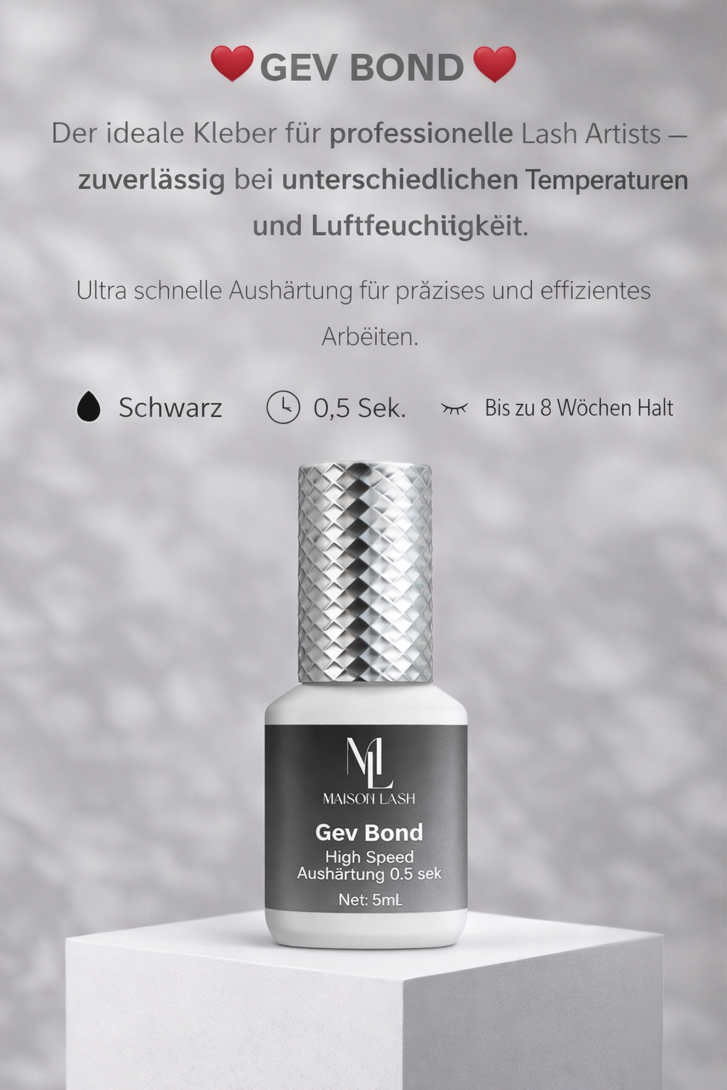 Mit 0,5 Sekunden Aushärtung, starkem Halt und einfacher Anwendung ist GEV Bond die ideale Wahl für Lash Artists, die höchste Ansprüche an Qualität, Schnelligkeit und sauberes Arbeiten stellen.